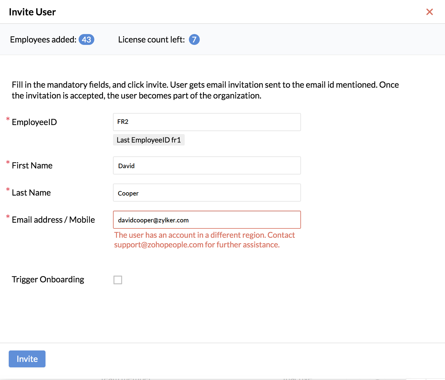 This error occurs when the employee has an account in another domain. This error is also reported when a user with the same email address exists in in any one of our data centers.
