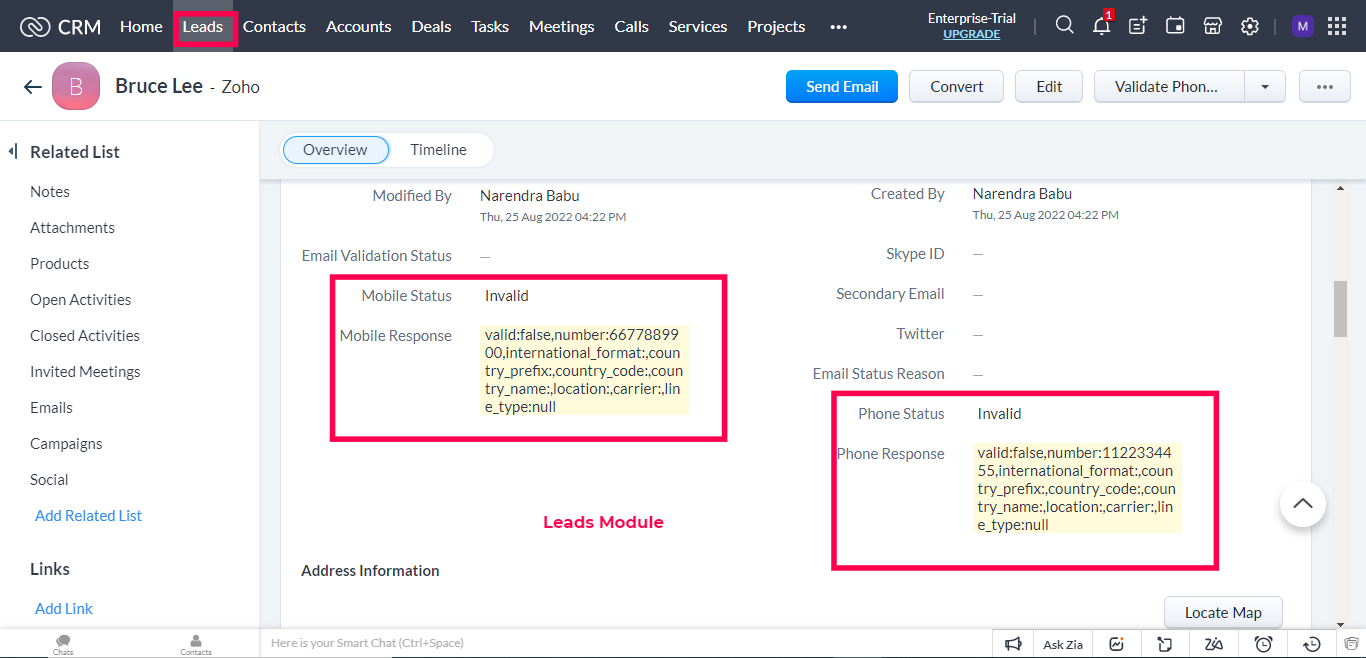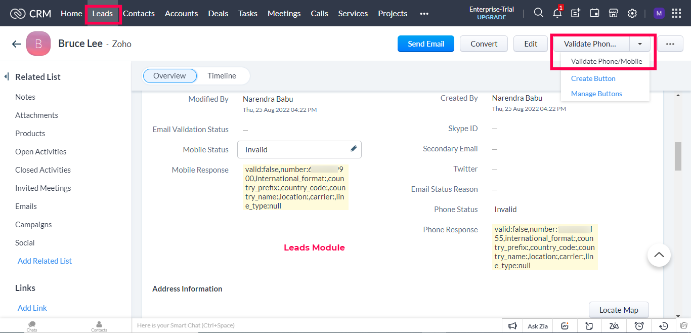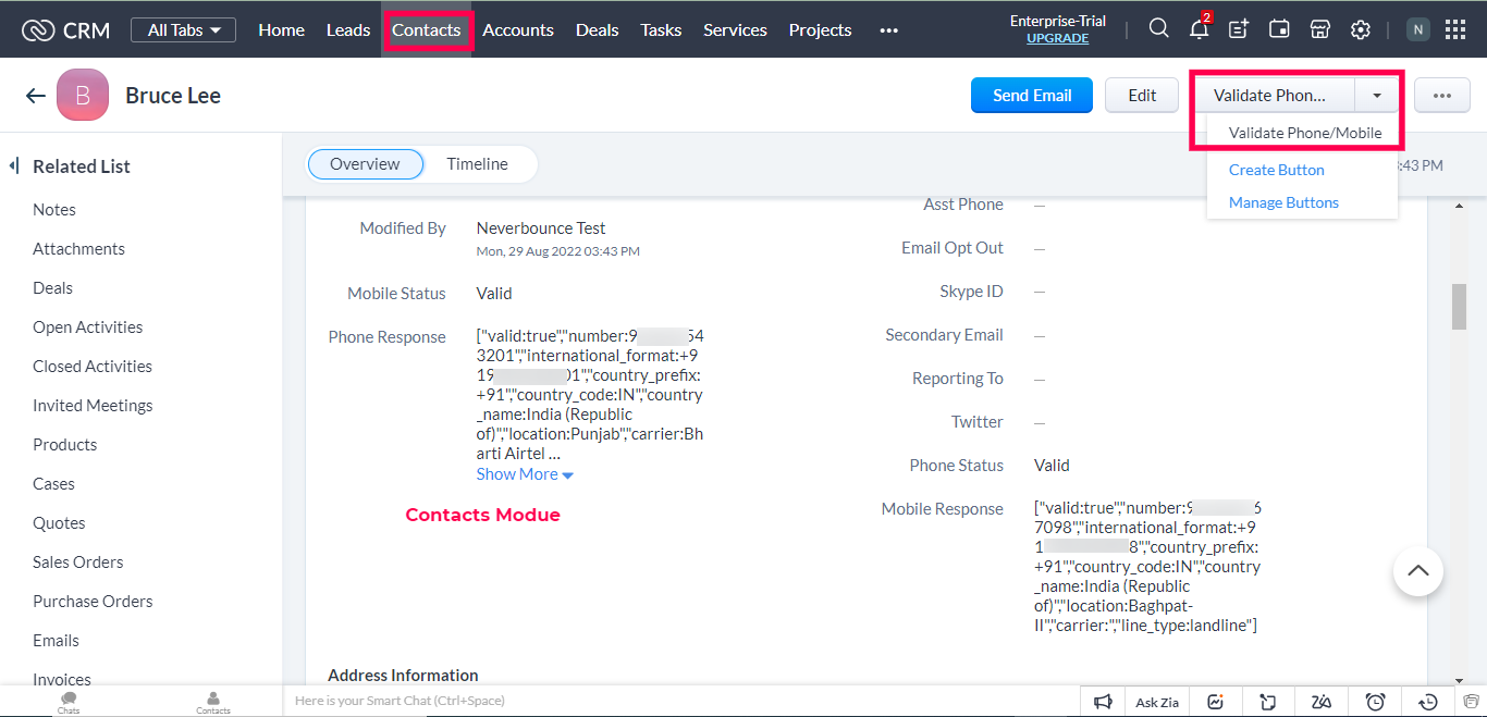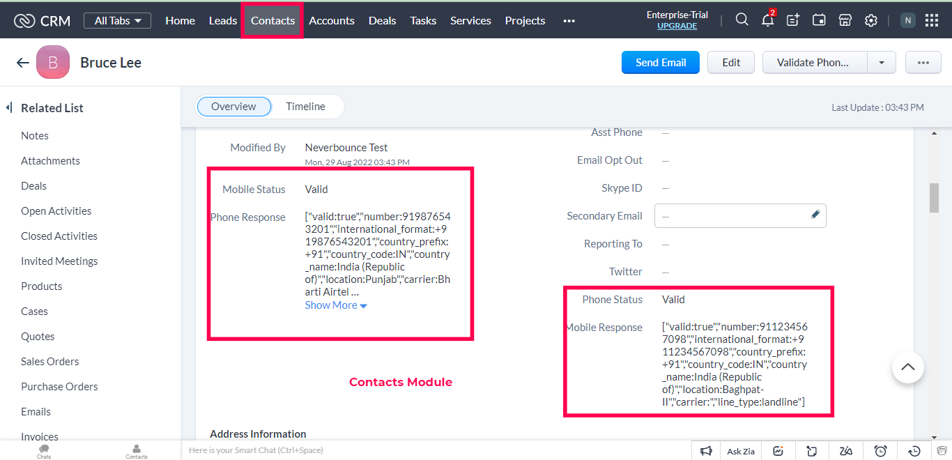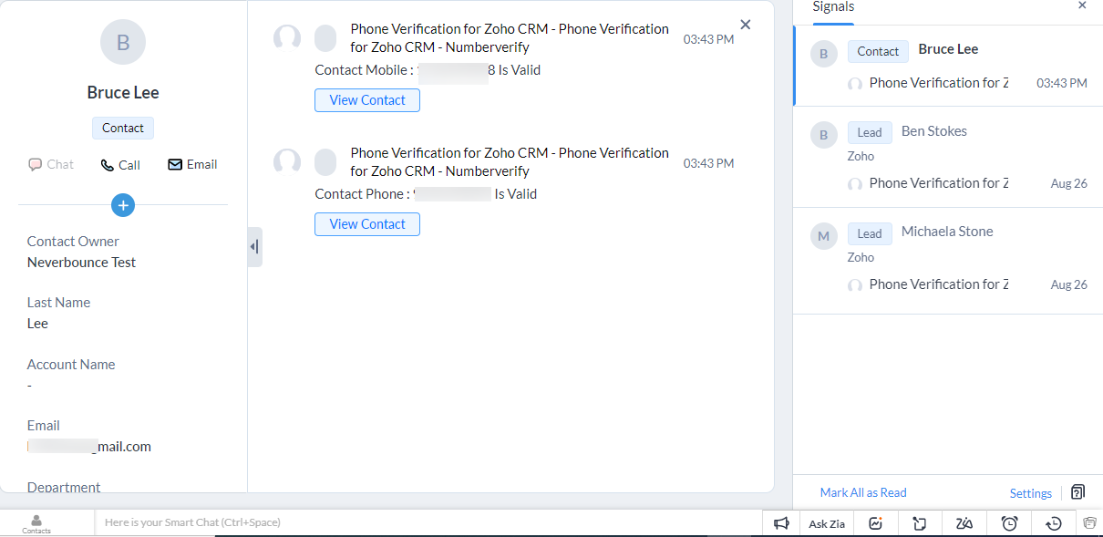 This is the sales signal which appears in CRM. You can notice the status of the validation of all numbers by clicking the bell icon.